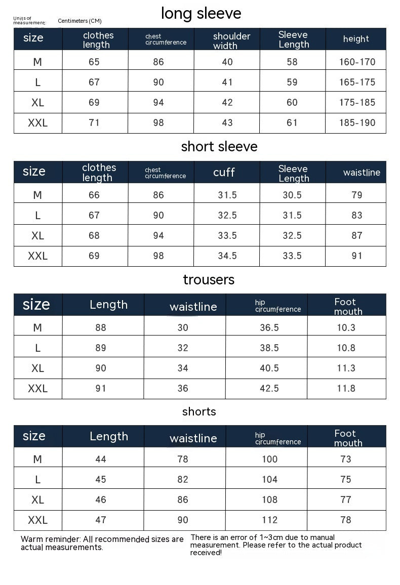 Short sleeved * 1, shorts * 1, long sleeved * 1, long pants * 1 Product Image: